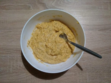 Выложите в полученную массу тыквенное пюре, хорошо перемешайте.