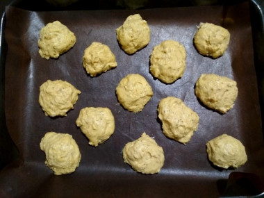 Скатайте из теста шарики величиной с грецкий орех. Выложите шарики на застеленный пергаментом противень, при этом каждый шарик немного придавите сверху. Правильно выбрать пергаментную бумагу вы сможете, прочитав отдельную статью про особенности пергамента, ссылка есть в конце рецепта.
