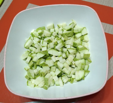 В это время нарежьте кубиками кабачки. У молодого кабачка кожура мягкая и её очищать не обязательно.