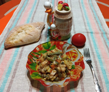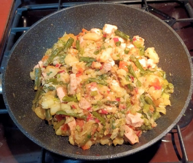 В нашей семье особой популярностью пользуются блюда с овощами. На сайте нашла ваш рецепт "Овощное рагу на сковороде с картошкой" и решила попробовать его приготовить. Чтобы немного улучшить его вкусовые качества я добавила в сковороду немного зелёной фасоли и грудку индейки, предварительно порезав её брусочками и обжарив до золотистой корочки на другой сковородке. Потом сложила всё вместе и потушила 20 минут с закрытой крышкой. Мясо сделало вкус блюда богаче и прекрасно вписалось в общую овощную гармонию. Результат порадовал меня и близких. Рецепт отличный, не слишком сложный, но интересный.