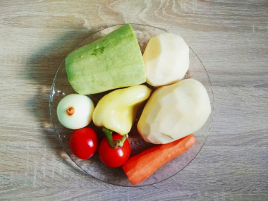 Как сделать овощное рагу с картошкой на сковороде? Подготовьте для этого необходимые ингредиенты. Пропорции и количество выбранных овощей можно немного поменять на свой вкус.