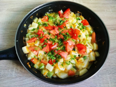 Когда картофель и кабачки станут мягкие, добавьте в сковороду нарезанные помидоры. Потушите все вместе еще минут 5-7 и снимите сковороду с огня. Для аромата добавьте немного чеснока.