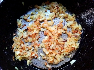Сковороду разогрейте до горячего состояния и налейте на неё немного растительного масла. Выложите измельченный лук и обжаривайте его пару минут на небольшом огне до прозрачности.