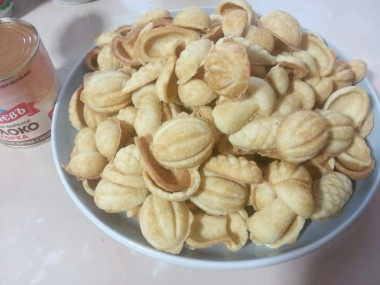 Рецепт моего детства, очень мы их все любим. Только непонятно, почему начинку надо в неостывшие орешки мазать, она же растает. Я готовлю так
