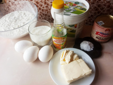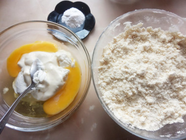Итак приступим. Из 3 стаканов муки, 100 граммов сливочного маргарина и 100 граммов сливочного масла готовим рубленное тесто. Масло и маргарин предварительно размягчить. Тесто должно получится однородное, без мельчайших крупинок. Яйца, майонез и стакан сахара взбить до полного растворения сахара. Добавить соду погашенную в уксусе. Данную массу смешать с рубленным тестом. Дальнейший процесс приготовления прост: выкладываем небольшие кусочки теста в формочки, прижимаем и выпекаем до готовности.