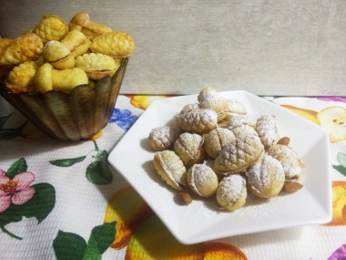 Печенье «Орешки» прекрасно подойдут для украшения любого праздничного стола. Особенно эта еда по нраву детям! Самое же интересное: раскрыть орешек и сначала съесть начинку, а потом все остальное! Да и самой приятно иногда сесть с кружечкой чая, в ароматах только что приготовленной выпечки, и вспомнить вкус бабушкиного печенья. А лучше позвать друзей, что бы ваши труды не остались без похвалы!