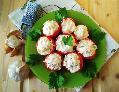 очень люблю такую закуску, готовлю ее часто, но помидоры не фарширую, а просто большие помидорки нарезаю кружочками, а на них выкладываю сырную массу
