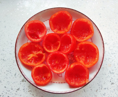 При помощи ложки и ножа аккуратно выскребите внутреннюю часть помидор вместе с семенами. Ее можно использовать при приготовлении других блюд, например, в зажарку для супа. Советую заморозить эту мякоть.