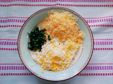 Сложите натертый яйца и сыр в миску. Зубчики чеснока очистите от шелухи и пропустите через пресс в яично-сырную смесь. Количества чеснока регулируйте на свой вкус, можете положить меньше.