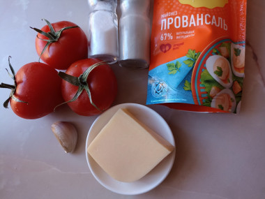 Как сделать помидоры с чесноком и майонезом? Подготовьте продукты. Помидоры возьмите одинакового размера, можно разных цветов, будет интереснее. Выбирайте твердые плоды, чтобы они не размякли при нарезке.