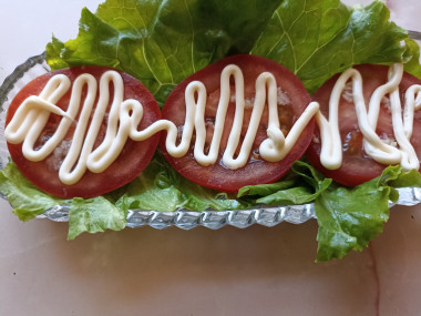 Вместо салата решила приготовить помидоры с чесноком и майонезом. Готовила небольшую порцию, поэтому чесночный майонез в кондитерском мешочке делать не стала, просто на каждый кружок помидора положила чуточку натёртого чеснока, присолила, поперчила, нанесла майонезную сеточку, сверху положила натёртый сыр. Очень вкусная пикантная закуска , сочная, остренькая, с ароматом чеснока. Спасибо за рецепт, katushafin!