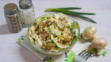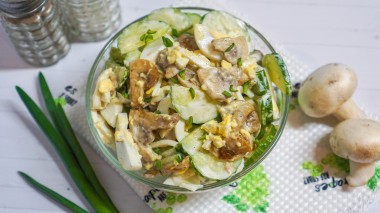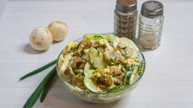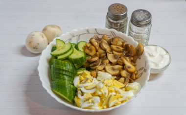 На ужин решила приготовить салат с грибами и огурцом. Подготовила необходимые ингредиенты. Шампиньоны взяла небольшого размера, свежие и упругие. Нарезала пластинками и обжарила до золотистости на сковороде. Яйца отварила, остудила и также нарезала небольшими пластинками. Огурец для салата использовала гладкий крупного размера, поэтому взяла 1 шт. В салатник выложила нарезанный огурец, яйца и обжаренные грибы, салат заправила сметаной 15% жирности и посыпала зеленым луком. Салат получился легким, вкусным и очень простым в приготовлении. Спасибо автору за рецепт!