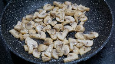 Разогрейте на среднем огне сковороду, налейте на нее растительное масло для жарки. Выложите грибы, посолите и поперчите по вкусу. Жарьте их, помешивая, около 5 минут, до румяности. Оставьте остывать.