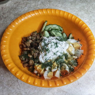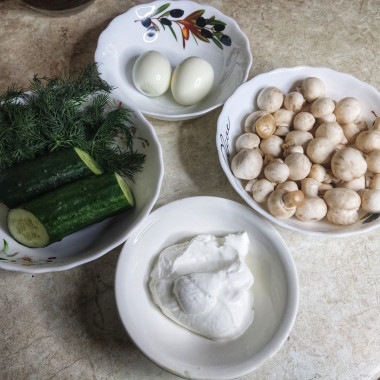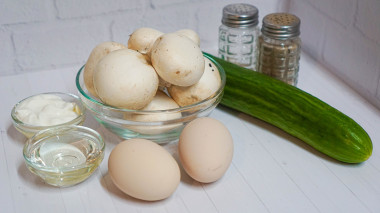 Как сделать салат с грибами и огурцом? Подготовьте продукты. Яйца заранее отварите и залейте холодной водой, чтобы они быстрее остыли. Огурец возьмите один большой или два маленьких. Вместо сметаны вы можете использовать майонез, но тогда изменится калорийность блюда, учитывайте это.
