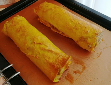 Запекался он около 40 минут. Как и рекомендовалось дважды смазала его взбитым яйцом. И в результате у рулета была супер аппетитная, румяная корочка!!!
