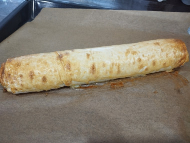 Запекайте рулет в заранее разогретой до 180С духовке 25 минут. За 5 минут до конца приготовления я еще раз смазала рулет яйцом, чтобы корочка была более румяная.