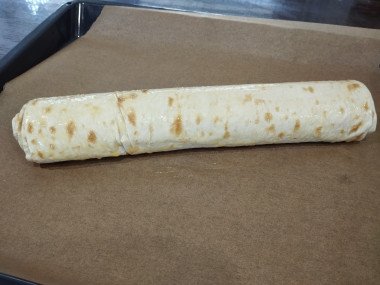 Накройте вторым листом лаваша, чтобы рулет был прочнее и не размок от сочности начинки во время запекания. Также смажьте второй лист лаваша яйцом. Делать это нужно побыстрее, так как краешки лаваша быстро подсыхают.