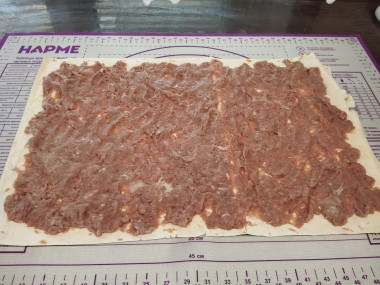 Лист лаваша смазала взбитым яйцом,сверху накрыла вторым листом лаваша. Также смазала яйцом, выложила фарш и равномерно распределила. Свернула в рулет,выложила на противень, смазала взбитым яйцом и убрала в духовой шкаф запекаться при 180 ° на 20 минут. Затем смазала ещё раз яйцом и ещё минут на 10.