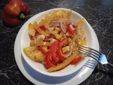 Яркие краски салата завораживают глаз. Красный и жёлтый перец, синий лук, кубики сыра - невероятно вкусное сочетание. Чесночок привнёс пикантности. А заправка необычная и потрясающе вкусная!