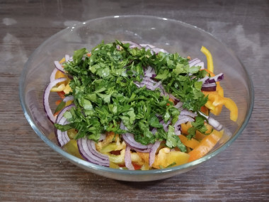 В миске соедините болгарский перец, красный лук и зелень. Полейте салат заправкой и перемешайте.
