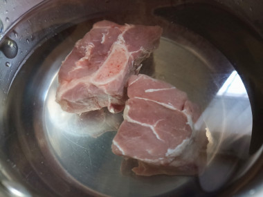 Мясо промойте. Мясо выложите в кастрюлю с кипящей водой. Добавьте в кастрюлю целую очищенную луковицу, 4 горошины душистого перца и 2 лавровых листа. Варите на медленном огне 1,5 часа до готовности мяса. В конце добавьте соль.