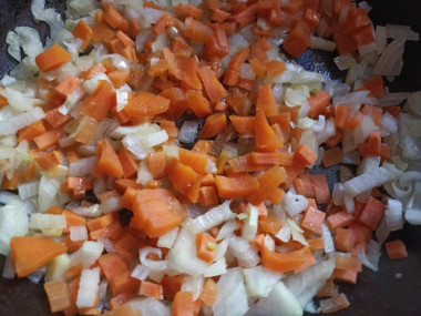 Добавьте морковь и обжарьте еще 5 минут до золотистого цвета.