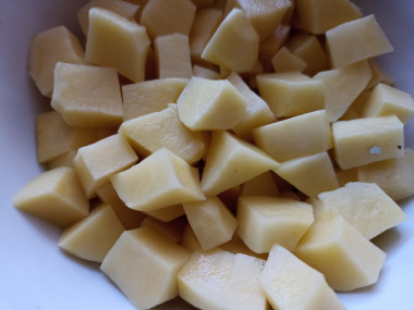 Помидор очистите от кожицы и нарежьте мелкими кубиками. Как легко снять с помидоров кожицу? Помойте их, сверху сделайте острым ножом надрезы крест-накрест. Опустите в кипяток на 1-2 минуты. Достаньте, слегка охладите и снимите кожицу.