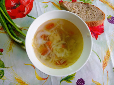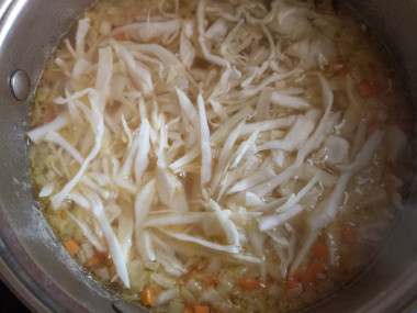 Добавьте капусту, оставшийся душистый перец и лавровый лист. Варите 10 минут. Свежую капусту можете заменить на квашеную.
