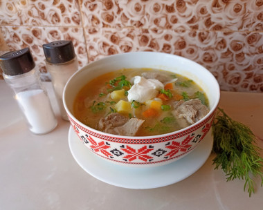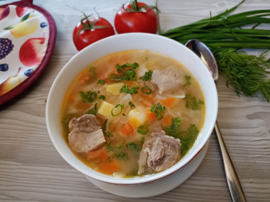 Бульон сварила на свином мясе на трёх литрах воды. Все остальные ингредиенты, кроме зелени (она у меня закончилась) , я взяла согласно рецепту.