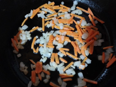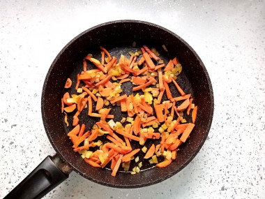 Измельченную морковь выложите в сковороду к луку. Перемешайте и обжаривайте все вместе еще пару минут. За это время морковь станет мягче.