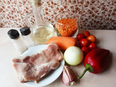 Как сделать чечевицу с мясом? Подготовьте все продукты по списку. Чечевицу можно использовать красную либо зелёную. Вместо помидоров допустимо взять томатную пасту или кетчуп.