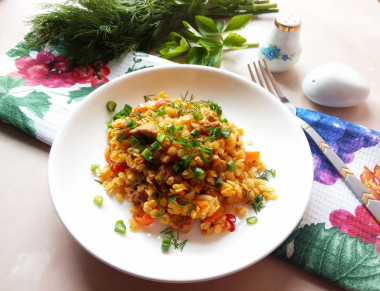 Добавьте крупу в казан, влейте натёртые томаты. Я добавила несколько штук помидоров черри для того, чтобы готовое блюдо выглядело более аппетитно. Посолите всё по вкусу, добавьте любимые специи.