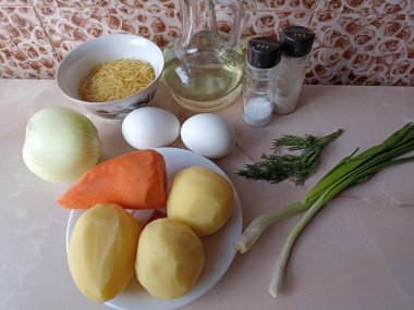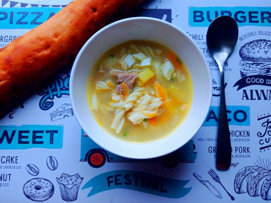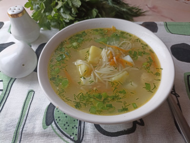 Вермишели у меня не было, вместо неё я добавила в суп макароны-спиральки. Из зелени положила мелко нарезанный зеленый лук. Все остальные действия сделала согласно рецепту.