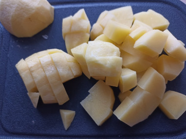 Картофель очистите от кожуры, ополосните и нарежьте на кусочки. Отправьте нарезанный картофель в бульон и оставьте вариться минут на 15.