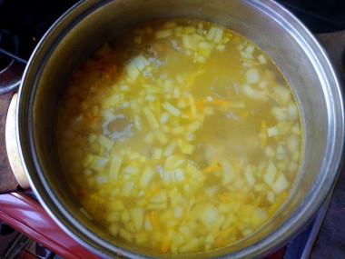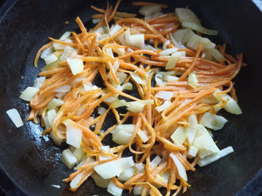 На горячую сковороду налейте растительное масло и обжаривайте лук с морковью 2-3 минуты. Затем отправьте готовую зажарку в кастрюлю.
