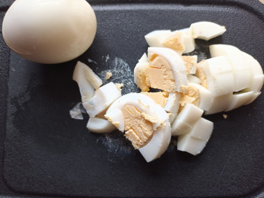 Отварные яйца очистите от скорлупы и нарежьте. Так же отправьте в суп.