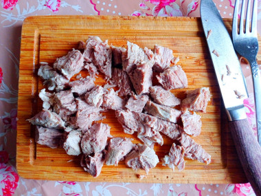 Мясо залейте холодной водой и поставьте на огонь. Доведите до кипения. При нагревании будет появляться пенка - её необходимо убрать. Варите мясо около часа. Затем мясо необходимо нарезать на несколько кусочков и вернуть обратно в бульон. По желанию бульон можно процедить.