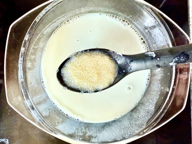 Готовила на 2 порции. Молока взяла 150 гр. желатина взяла 6 г, так как часть десерта сделала в креманках. У меня кокосовое молоко находилась в холодильнике, поэтому оно расслоилось на сливки и кокосовую воду, вручную перемешать не удалось. Поэтому желатин замочила в кокосовой воде от молока, а кокосовые сливки (твёрдые) прогрела на огне, чтобы они стали жидкими. Затем, к растворённым кокосовым сливкам влила разбухший желатин с кокосовой водой.
