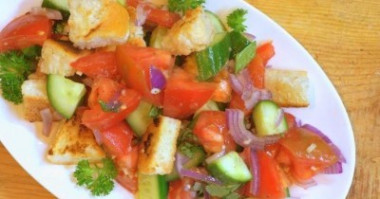Очень заинтересовал этот рецепт салата Панцанелла. Название очень красивое, думала, будет какой-нибудь сложный в исполнении салат , а оказалось всё просто)) У меня еще был болгарский перец, его тоже добавила. Очень понравилась заправка. Просто и вкусно, и название изысканное)) Спасибо автору!