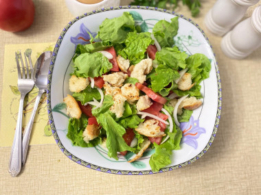 Полейте заправкой салат. И выложите сверху сухари. Аккуратно перемешайте салат. Сразу же подавайте его к столу — постояв, овощи пустят сок, зелень увянет, а сухари размокнут.