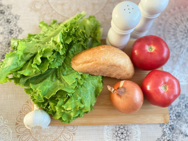 Готовится очень быстро и просто, взяла свежие овощи и зелень, свежих хлеб поломала на маленькие кусочки.