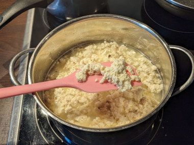 Постепенно хлопья будут становиться крупнее, начнет отделяться сыворотка. Не желтая, как при варке творога, а белая и непрозрачная. Кипятите молоко еще около 5 минут. Не забывайте его помешивать. Чем дольше вы будете варить сыр, тем тверже он получится. Поэтому, если вы хотите более мягкий сыр, сократите время варки.