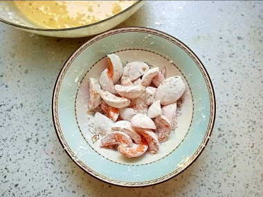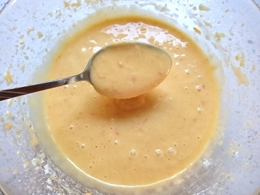 Тесто после замешивания стало густым, но текучим. Для подстраховки все же добавила половину чайной ложки разрыхлителя. Раз уж в тесто входит кукурузный крахмал, то решила в нем же обвалять кусочки абрикосов.
