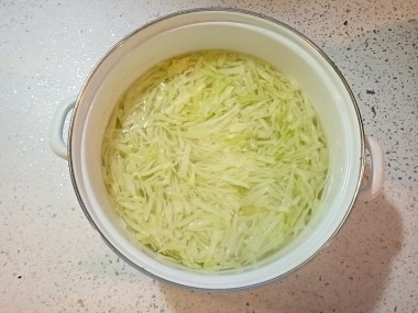 Капусту нашинкуйте. Очищенный картофель нарежьте небольшими кусочками. Выложите капусту и картофель в кастрюлю и оставьте вариться минут на 15.