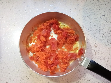 Выложите нарезанные помидоры в сковороду, перемешайте и обжаривайте все вместе еще 2-3 минуты. За это время помидоры пустят сок и станут мягкие. Они смешаются в общую массу с луком и морковью.