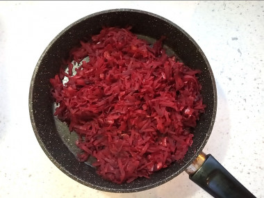 Свеклу потрите на терке и обжаривайте 5-7 минут. За это время свекла немного уменьшится в объеме и станет мягкая.
