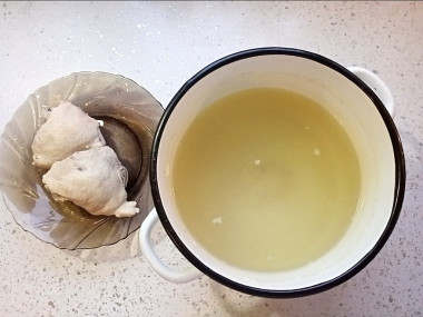 Курицу залейте водой, поставьте на огонь и доведите до кипения. При нагревании будет появляться пенка - её необходимо убрать. Проварите минут 20. Затем отделите мясо от костей и верните его в процеженный бульон.