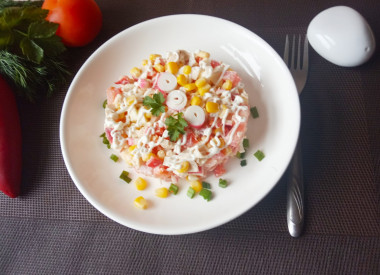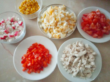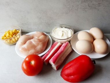 Сделала салат с курицей и крабовыми палочками. Куриное филе и яйца лучше отварить заранее. Салат получается яркий, сочный, очень вкусный. Помидоры и болгарский перец хорошо освежают салат и обогащают его витаминами. Спасибо за рецепт, Юлия М!