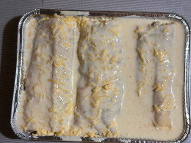 Залейте рулетики из лаваша полученной заливкой, равномерно распределите.Шаг 13: