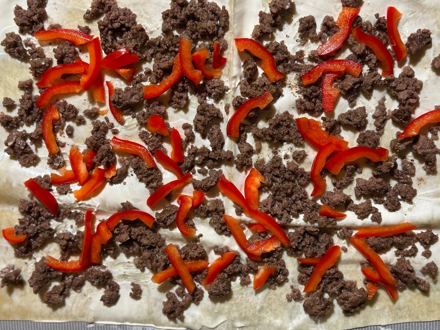Помидоры помойте, удалите плодоножку и нарежьте кольцами. Равномерно распределите по поверхности лаваша начинку из фарша с луком и помидоры.Шаг 7: